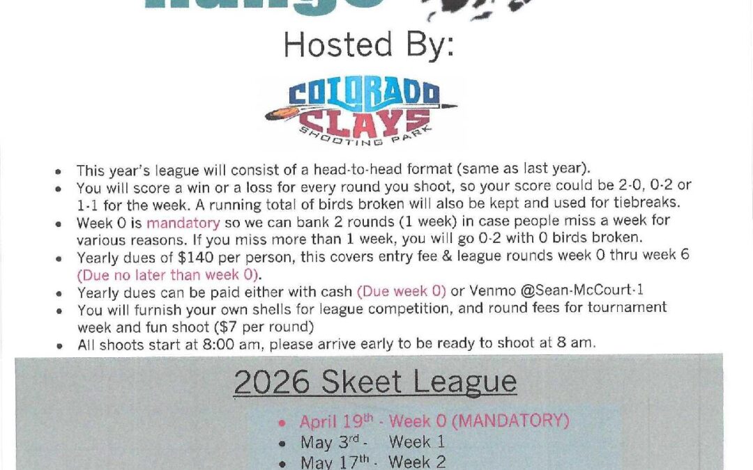 100 Target NSCA Shoot CSCA Youth Scholarship Fundraiser in Honor of Makayla Dame The Colorado Sporting Clays Association is dedicated to the support and promotion of youth involvement in shooting sports. John McCord started the[...]